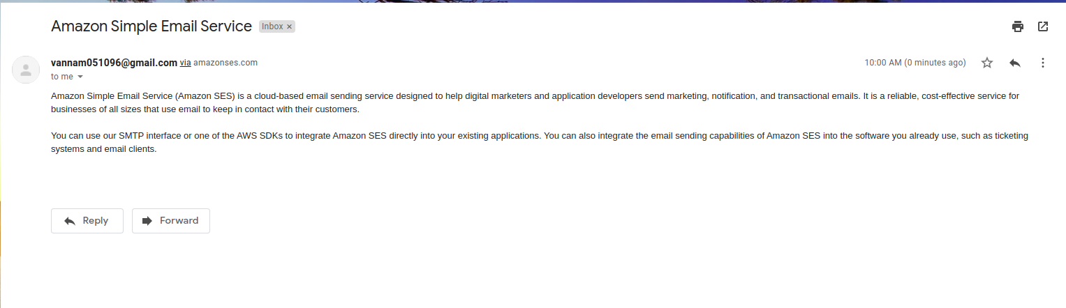 Amazon Simple Email Service (Amazon SES) là dịch vụ gửi email trên nền tảng đám mây được thiết kế để giúp các chuyên gia marketing kỹ thuật số và nhà phát triển ứng dụng gửi email marketing, thông báo và giao dịch. Đây là dịch vụ tin cậy, tiết kiệm chi phí dành cho các doanh nghiệp thuộc đủ mọi quy mô sử dụng email để giữ liên lạc với khách hàng của mình.