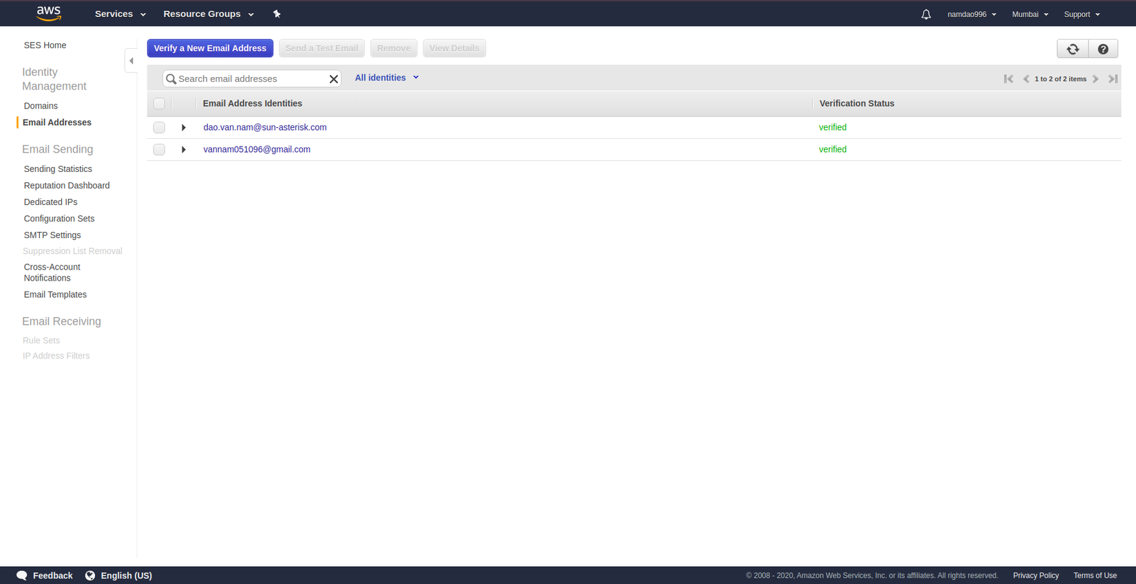 - Click chọn Email Address và verify email 2 email dùng để gửi và nhận.
