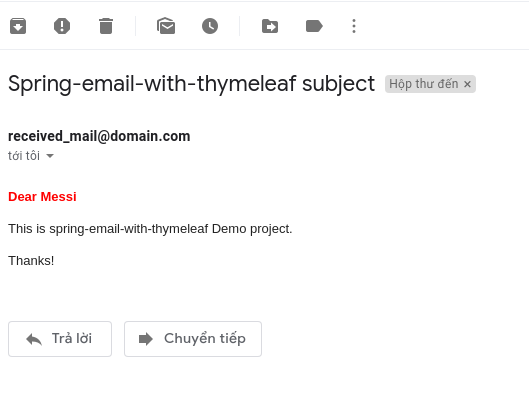 String MAIL_TEMPLATE_PREFIX = "/templates/"vàString MAIL_TEMPLATE_SUFFIX = ".html": ứng dụng sẽ truy cập vào thư mụctemplatestrong resources và quét tất các những file.htmlđể sử dụng cho việc get template.TEMPLATE_NAME = "mail-template": Tên của file HTML template. Có nghĩa là chúng ta phải cấu hình 1 file HTML có tênmail-template.htmltrong thư mụcresources/templates.context.setVariable("name", "Messi")vàcontext.setVariable("project_name", "spring-email-with-thymeleaf Demo"): tùy biến truyền vào trong file template.