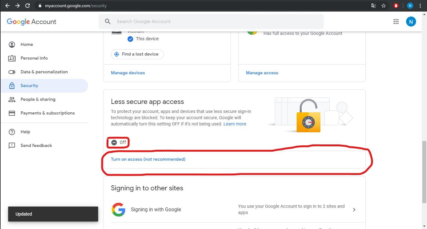 - Cho phép các ứng dụng bảo mật thấp truy cập: Vì bảo mật nên gmail sẽ mặc định cái này bị tắt!