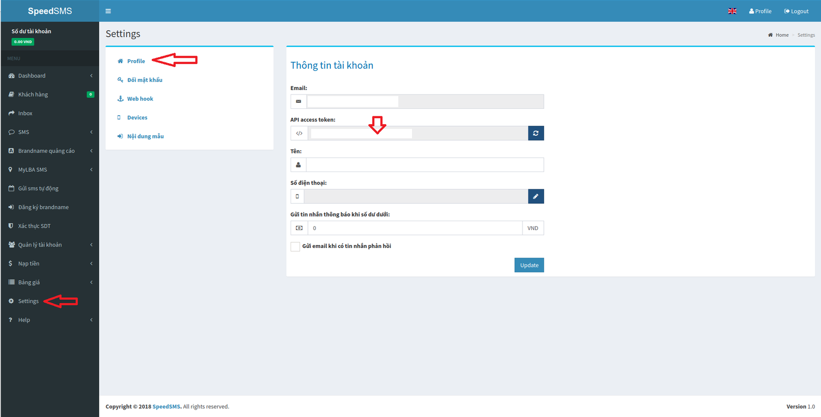 Để lấy API access token, bạn vui lòng đăng nhập tại địa chỉ https://connect.speedsms.vn, sau đó vào menu: "Settings" chọn "Profile".