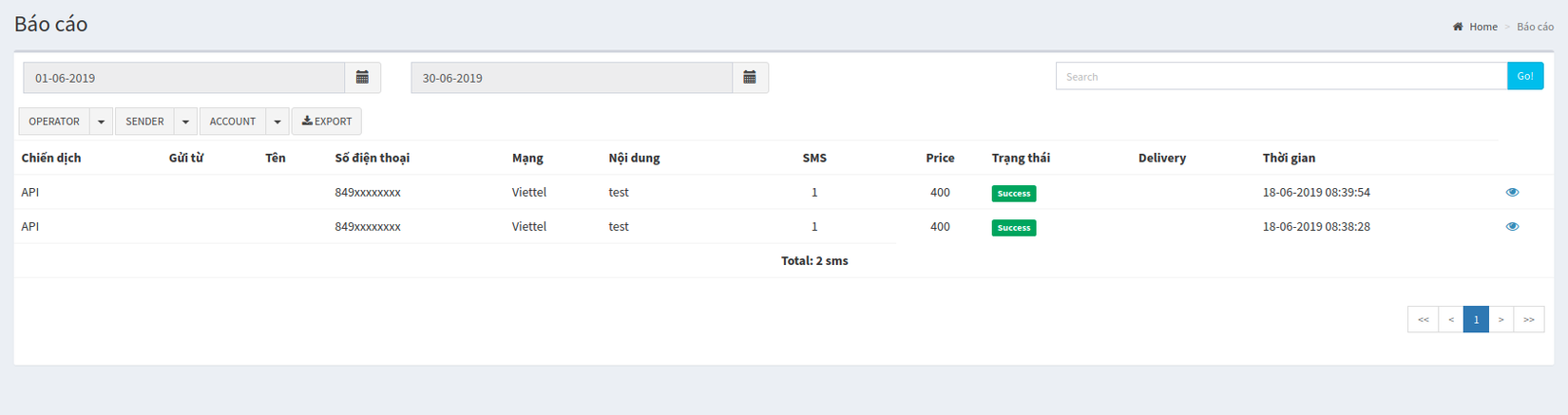 { "status": "success", "code": "00", "data": { "tranId": transaction id number, "totalSMS": total sms number, "totalPrice": total price number, "invalidPhone": array of phone numbers } }