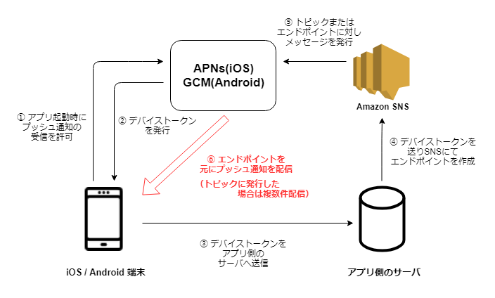 Về cơ bản, nó gần giống như [1. Cơ chế push notification], nhưng Amazon SNS làm trung gian giữa server ở phía ứng dụng và dịch vụ phân phối thông báo đẩy của mỗi thiết bị. Server nhận device token từ smartphone, chuyển cho Amazon SNS đăng kí và tạo endpoint. Khi endpoint được tạo, subscribe topic có thể thực hiện từ server ứng dụng thông qua API hoặc trực tiếp từ Amazon SNS, khi gửi push notification, thống báo sẽ được gửi qua topic và gửi đến các device đã subcribe. API để sử dụng Amazon SNS từ bên ngoài được AWS cung cấp và có thể được sử dụng dễ dàng. Tất cả những việc như đăng ký endpoint, tạo và đăng ký topic có thể được thực hiện bằng API. Vui lòng tham khảo URL sau để biết chi tiết về API. [https://docs.aws.amazon.com/sns/latest/dg/mobile-push-api.html]