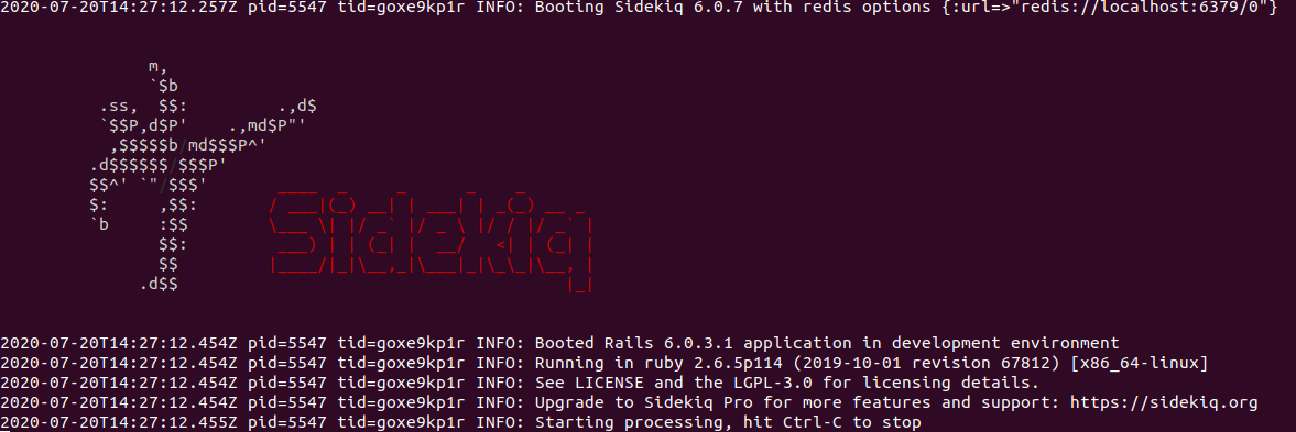 Để có thể thấy được khái quát hơn về redis-server sudo service redis-server stop để dừng và redis-server bắt đầu lại lúc đó chúng sẽ có 2 giao diện của Sidekiq và Redis như sau (bật redis-server trước sidekiq):