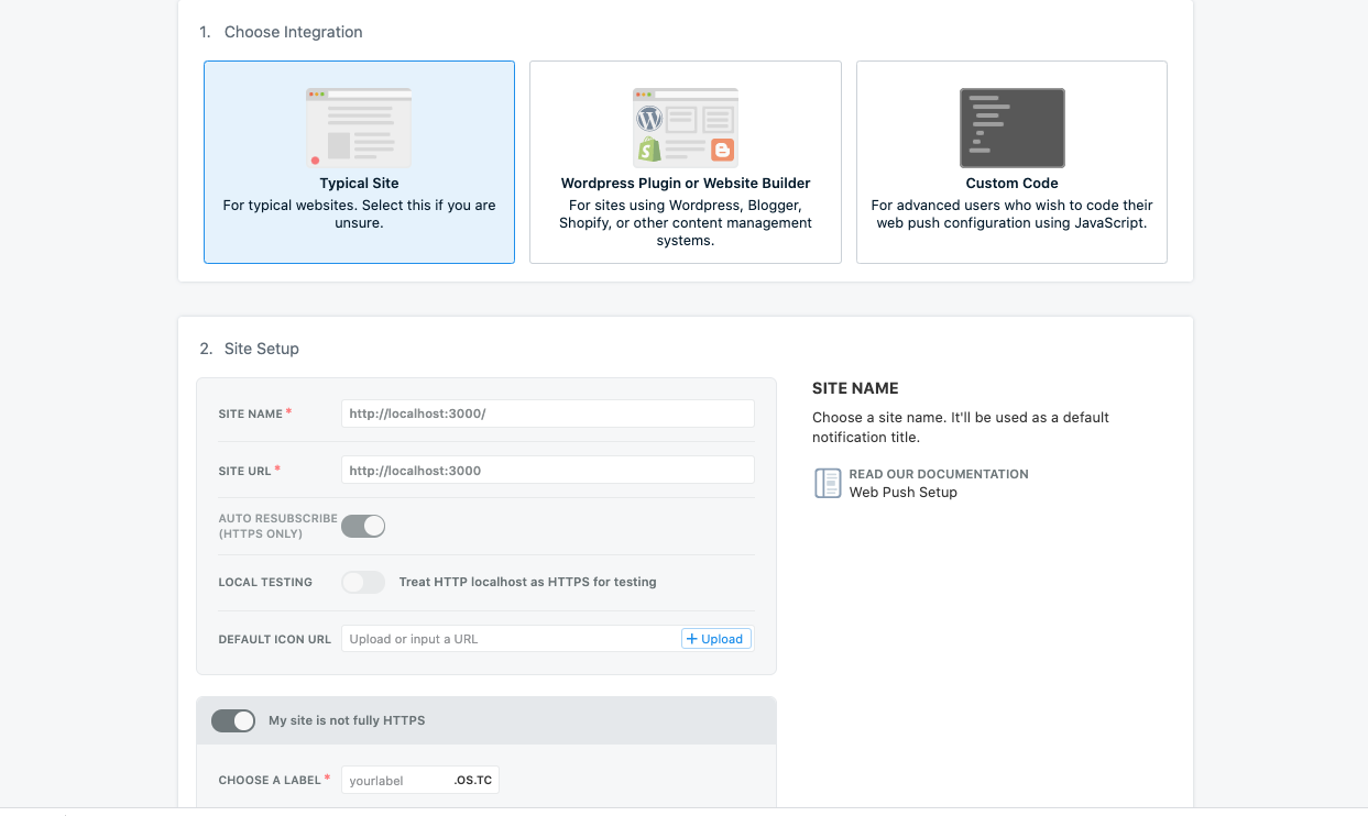 Chọn Typical Site. Trong Site setup, điền Site name, site url, và để test trên localhost, chúng ta phải enable option: "My site is not fully HTTPS" và điền label vào.