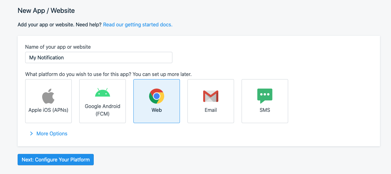 Đầu tiên, tạo tài khoản với OneSignal và ấn vào "New App/Website"