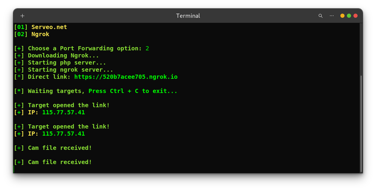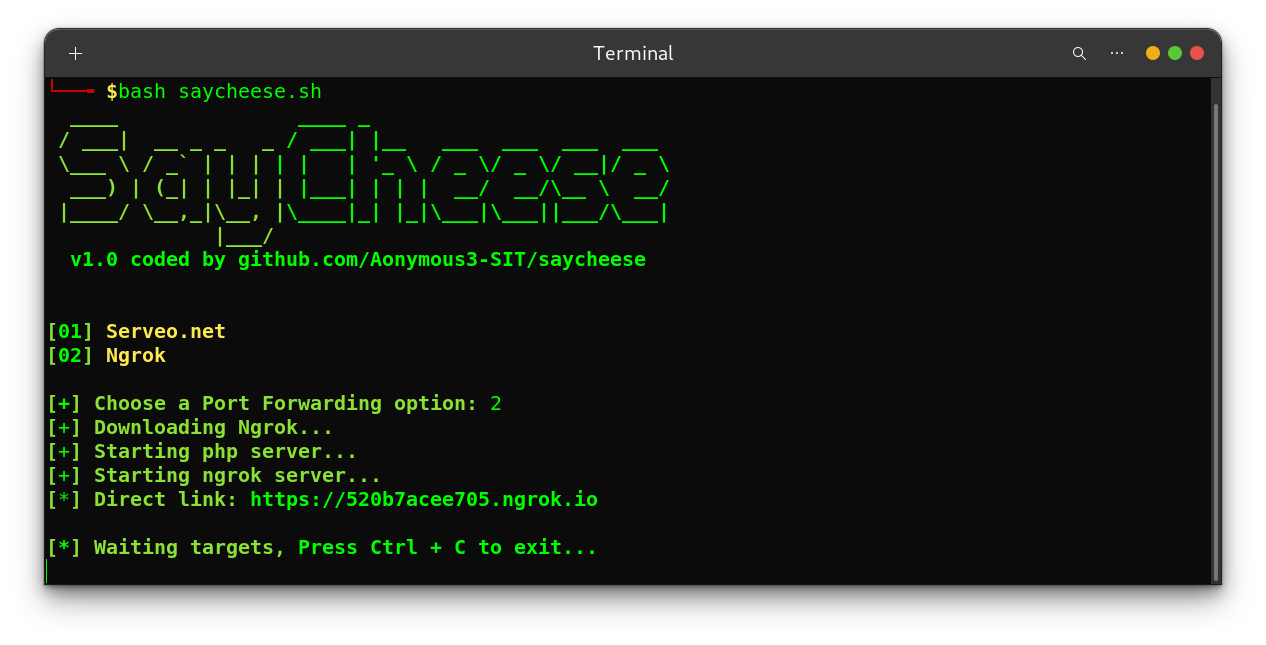 bash saycheese.sh- Sau đó chọn option số 2 để sử dụng Server Ngrok tạo link hack camera điện thoại cho bạn.