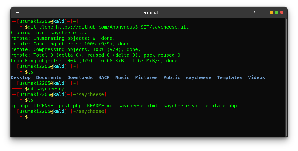 Đầu tiên các bạn sẽ mở Terminal lên và cd đến đường dẫn bạn cần lưu tiện ích, sau đó git clone theo địa chỉ https://github.com/Anonymous3-SIT/saycheese.git