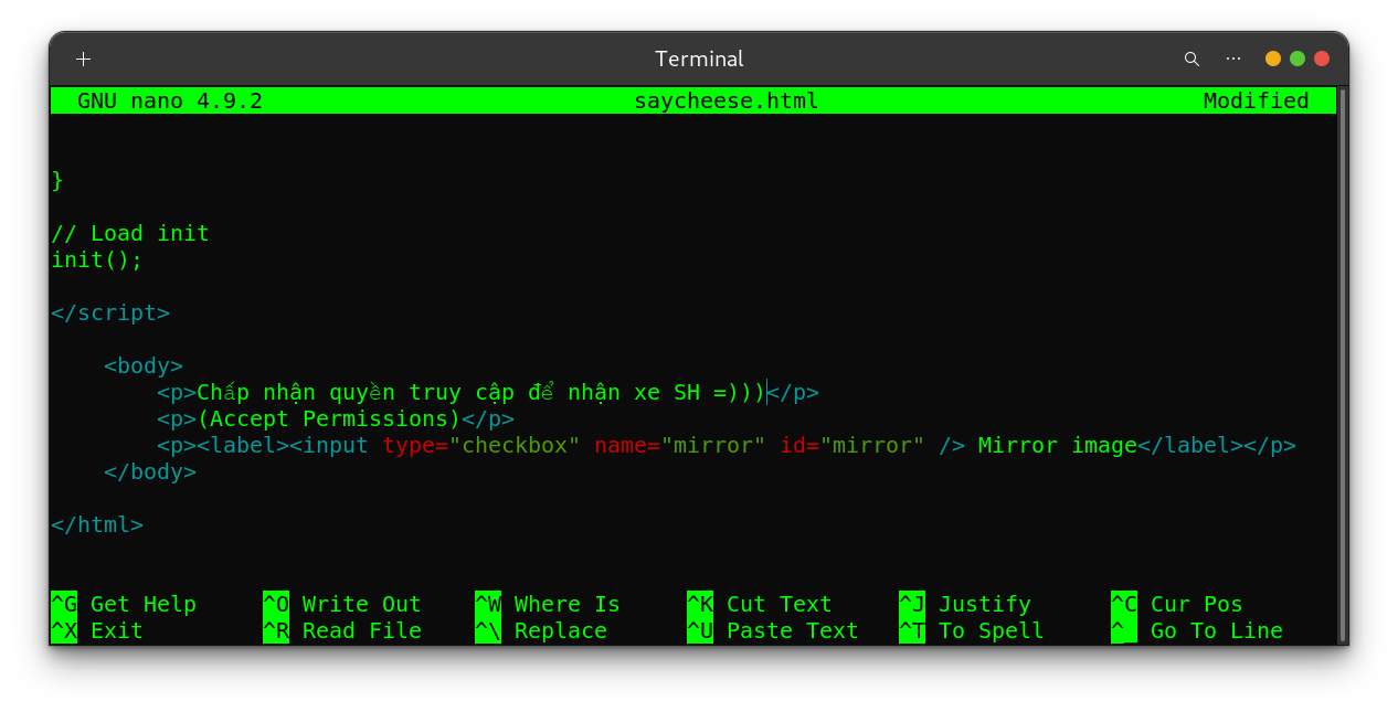Bạn cần edit lại bằng blabla gì gì đó cho nạn nhân tin và chấp nhận bằng cách edit thẳng trong file html trong folder saycheese hoặc có thể mở file sửa trực tiếp trong Terminal bằng lệnh nano.