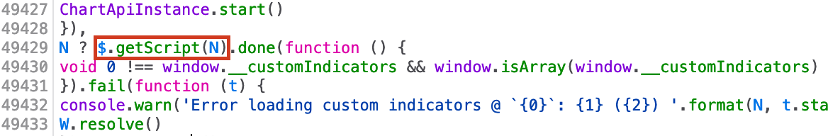 - Sau khi lỗ hổng được công khai, TradingView đã phát hành phiên bản mới để fix nó. Chức năng, chịu trách nhiệm tải biểu đồ của bên thứ ba, đã được thay đổi. Phiên bản mới của chức năng này trong như sau.