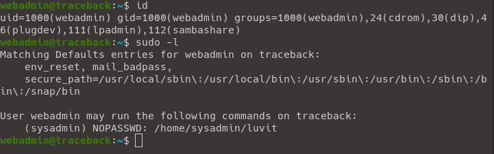 Tại đây chúng ta leo quyền lần 1 để lấy flag của sysadmin, phương thức mà Owner chủ định là sử dụng Sudo Rights, các bạn có thể đọc bài viết chi tiết tại đây.