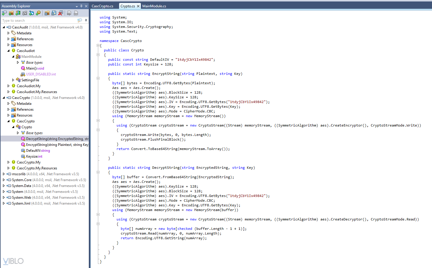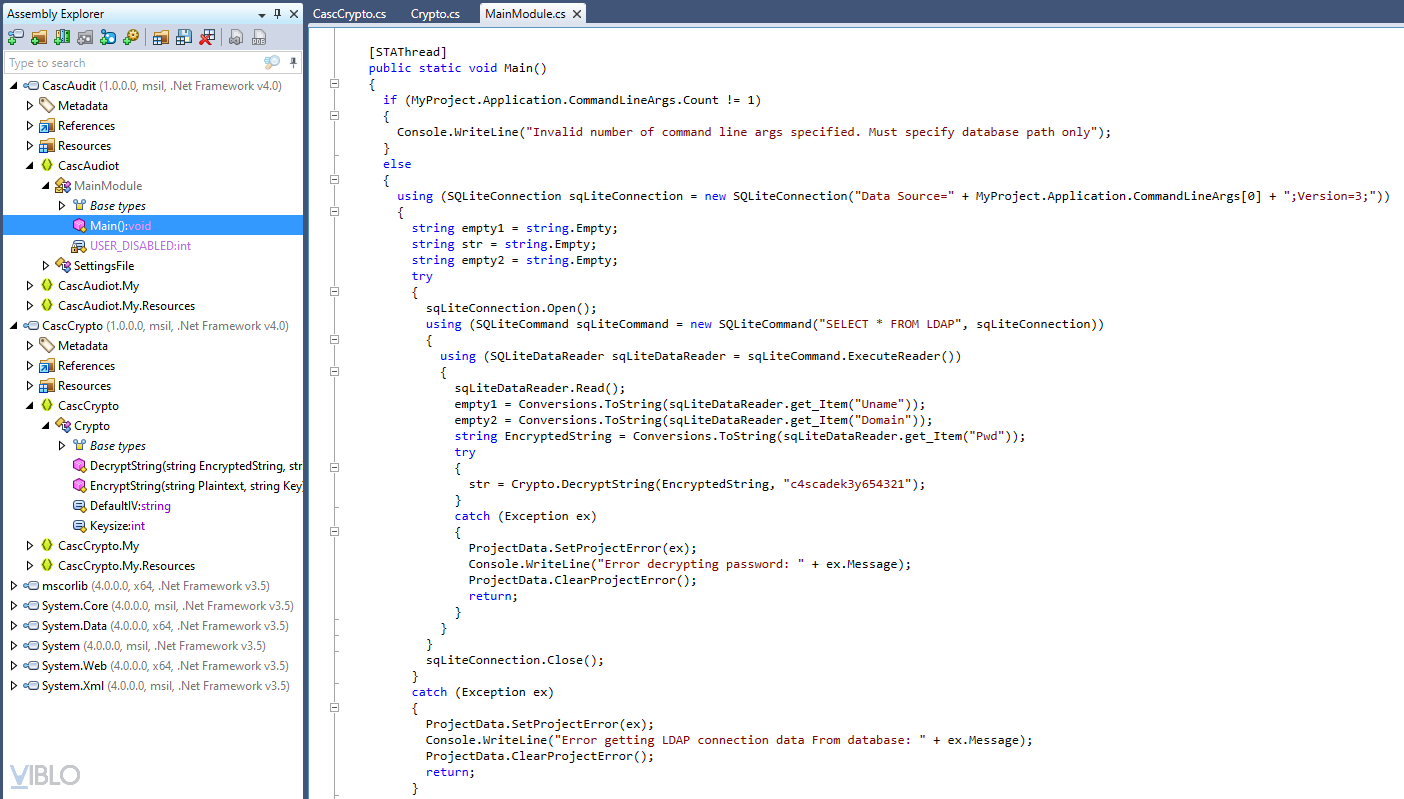 Chúng ta lấy được 1 đoạn encrypt bằng base64. Tuy nhiên sau khi giải mã thì dường như đoạn mã hoá này phải thêm 1 bước giải mã nữa. Thực hiện decompile CaseAudit.exe và CaseCrypto.dll bằng dotPeek để xem chương trình thực hiện mã hoá và giải mã như nào.