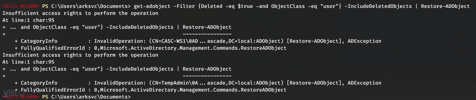 *Evil-WinRM* PS C:\Users\arksvc\Documents> get-adobject -Filter {Deleted -eq $true -and ObjectClass -eq "user"} -IncludeDeletedObjects