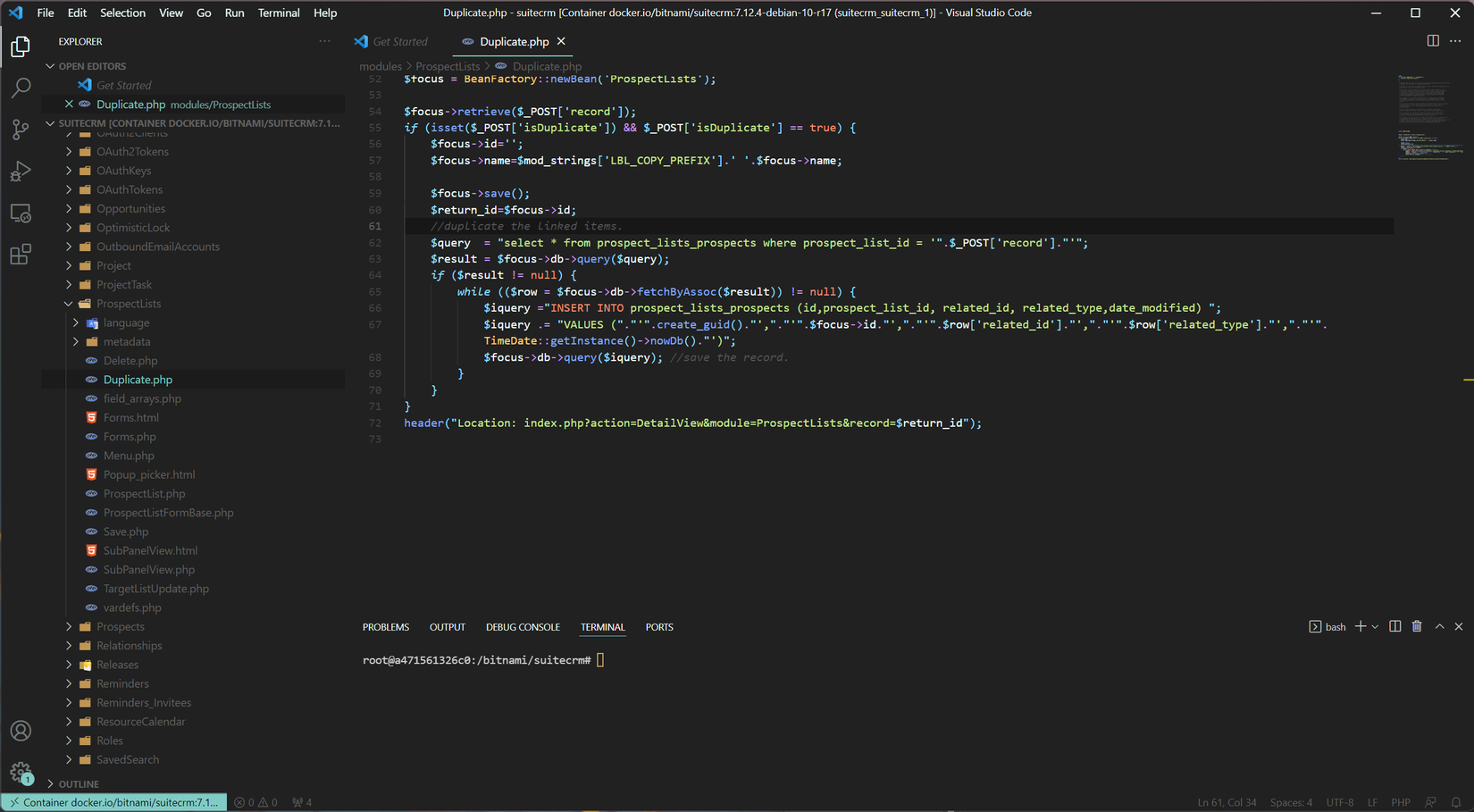 Để setup debug thì một trong những lựa chọn mì ăn liền và đỡ tốn công nhất đấy chính là sử dụng docker. Rất may mắn là SuiteCRM được bitnami đóng gói thành docker sẵn sàng, nên với file docker-compose.yml dưới đây, mình đã nhanh chóng có môi trường để debug. Ở đây mình chọn docker tag là 7.12.4, là phiên bản trước khi fix lỗi.