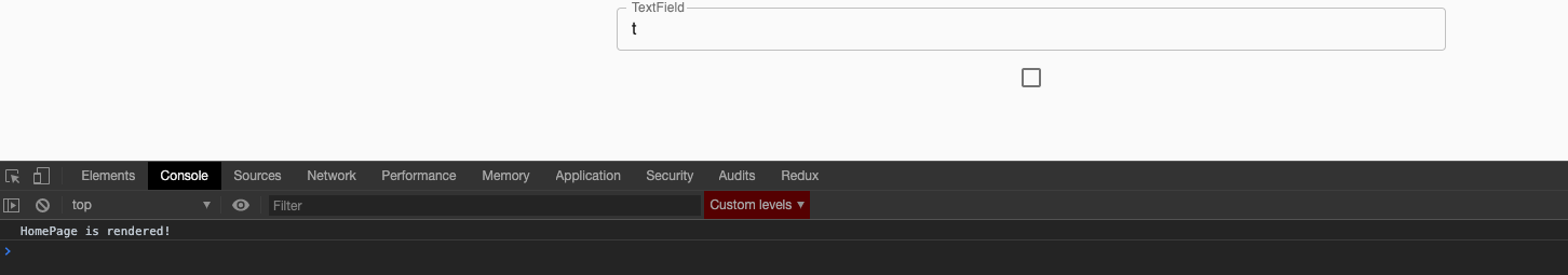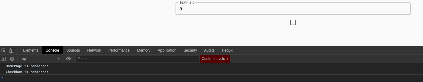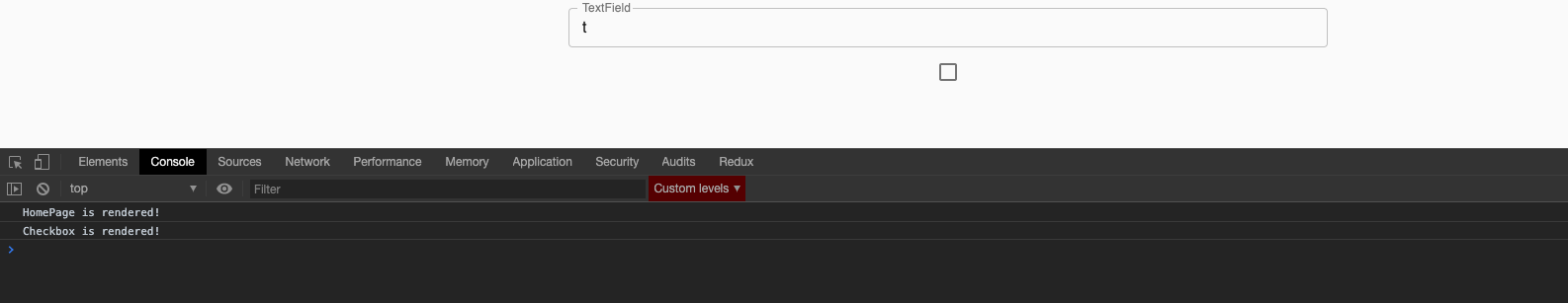 const Foo = () => { // ... const toggleChecked = () => setIsChecked(!isChecked); return ( <> <TextField margin="normal" variant="outlined" label="TextField" value={text} onChange={e => setText(e.target.value)} /> <Bar value={isChecked} onClick={toggleChecked} /> </> ); }; const Bar = ({ value, onClick }) => { console.log('Checkbox is rendered!'); return <Checkbox value={value ? 'checkedB' : ''} onClick={onClick} />; };- Kết quả: Bar lại bị re-render*