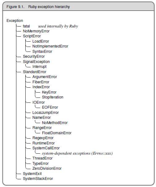 Tất cả các ngoại lệ và lỗi đều kế thừa từ class Exception và nhiều trong số chúng (các ngoại lệ bên ngoài hệ thống phân cấp StandardError) được Ruby sử dụng riêng cho các chức năng chung của môi trường nội bộ Ruby.