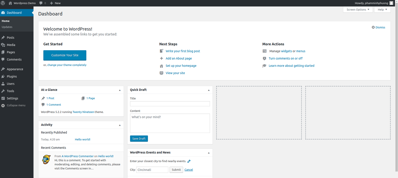 Ok sau khi bạn chạy đến bước này cơ bản là đã cài đặt xong website wordpress rùi đó, các bạn nhấn install và đăng nhập vào tài khoản bạn vừa đặt nhé. Giao diện đầu tiên mà bạn nhìn thấy là trang quản trị: