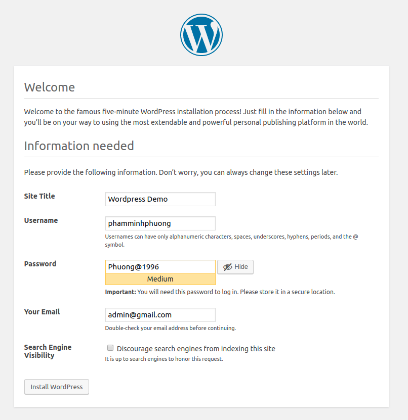 - Bạn nhập tên website ban đầu, username, password, email đăng nhập trang quản trị: