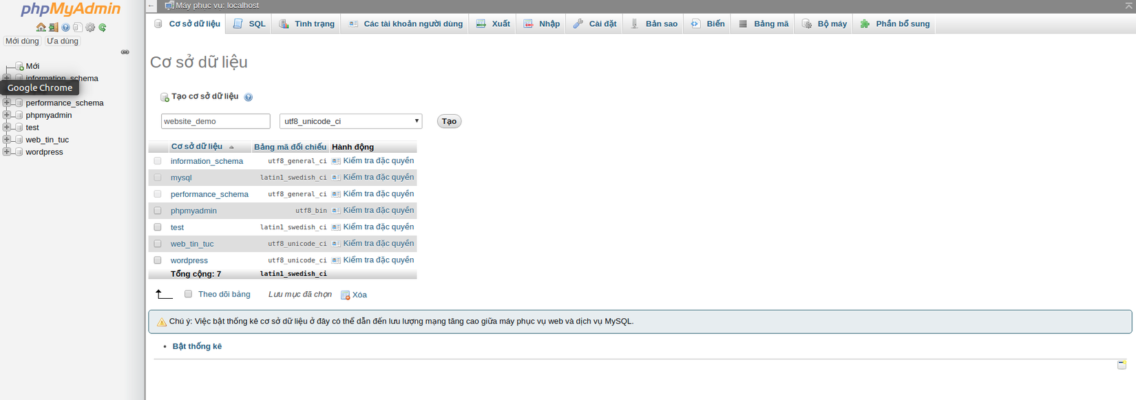 B2: Tạo database các bạn truy cập vào địa chỉ http://localhost/phpmyadmin/ ở đó lưu trữ các database để chạy wordpress: