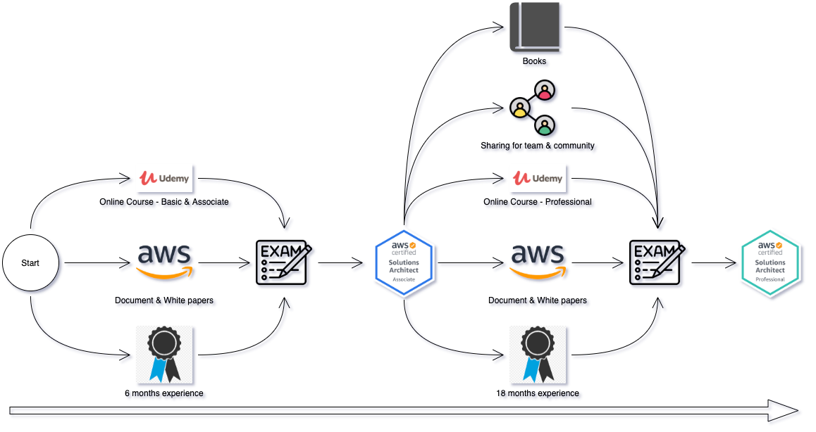 Trở thành Solution Architect (SA) là mục tiêu ngắn hạn của tôi (5 năm), việc chinh phục AWS Cerfiticate Professional là một phần trong kế hoạch của tôi để bổ sung kiến thức, kinh nghiệm trước khi trở thành một SA chuyên nghiệp. Tôi đặt mục tiêu 1 năm để học và lấy chứng chỉ AWS Cerfiticate Professional và tôi mất hơn 1 năm để hoàn thành mục tiêu đó. Tôi chia nhỏ mục tiêu đó thành những giai đoạn để hoàn thành, bạn hãy xem kĩ hơn ở hình bên dưới nhé.