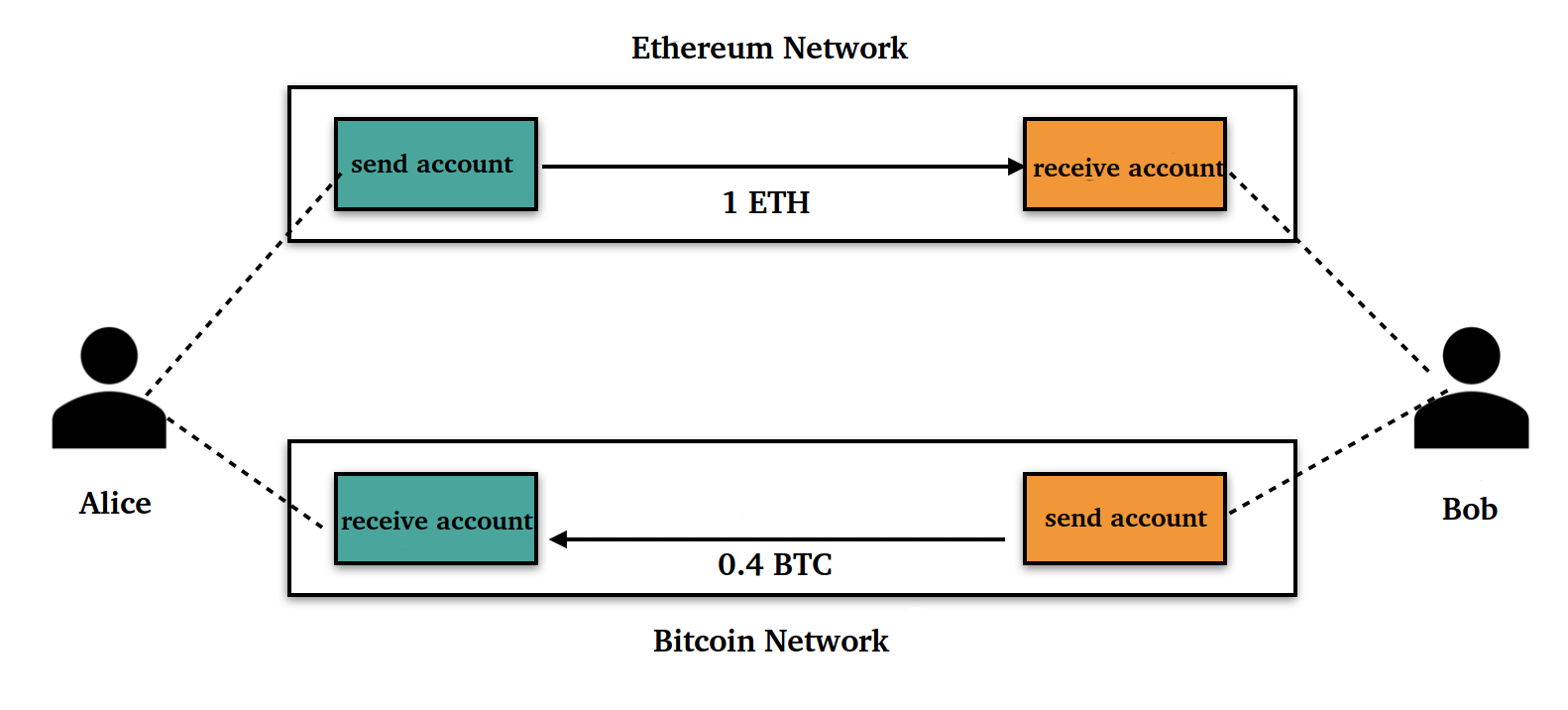 Kịch bản của chúng ta sẽ gồm hai người Alice người giữ Ethereum và Bob người giữ Bitcoin . Hai người này sẽ thực hiện trao đổi Eth và BTC mà không cần phải tin tưởng lẫn nhau . Quá trình này bao gồm hai bên và bốn tài khoản, vì vậy quá trình sẽ gồm :