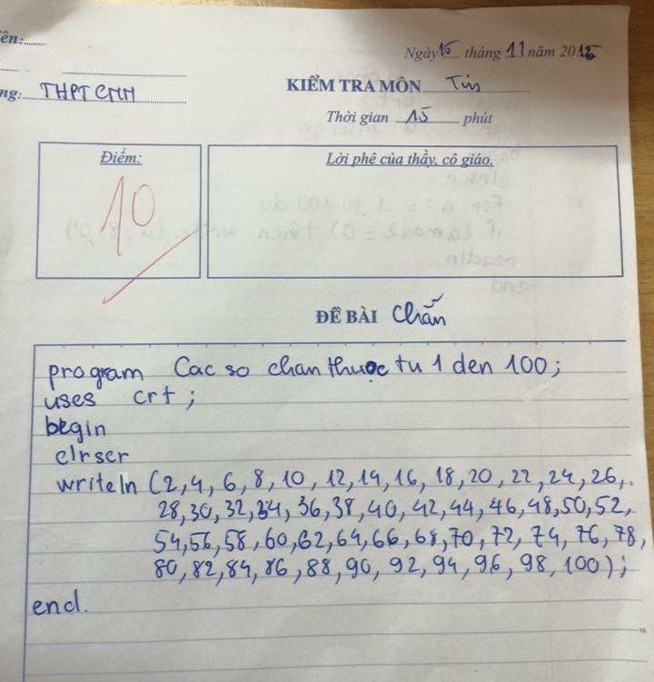 Có hàng tỉ cách để in ra được dãy số này, nhưng ai mà quan tâm cơ chứ? Cái mà người ta mong muốn là gì? Là chương trình in ra được dãy số trên, tất cả chỉ có vậy. Ông khách kia trả tiền để có được sản phẩm, chứ không phải code hay thuật toán gì cả.
