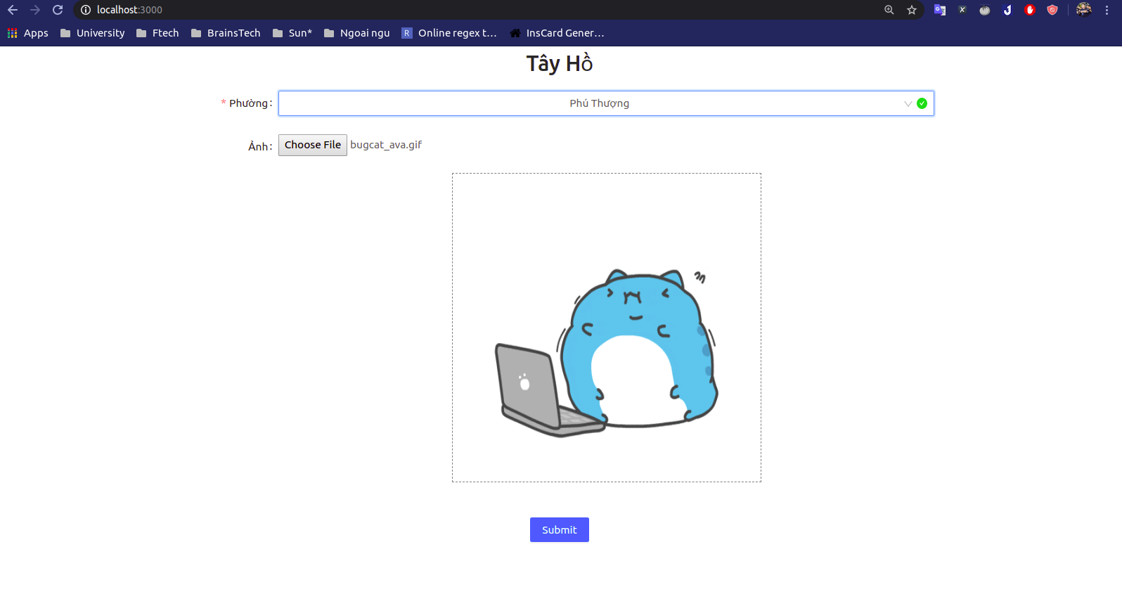 render()rồi nó sẽ lại Mount lại lần nữa và gọi đến hàmcomponentDidMount()và sẽ thay đổithis.state.wardsvới giá trị các quận từ API. VàrenderWardOptđược gọi trong render sẽ tạo ta các CardOption. - Nhưng giờ chọn ảnh vẫn chưa hiển thị vậy thì ta phải viết một hàm biến file tải lên thành