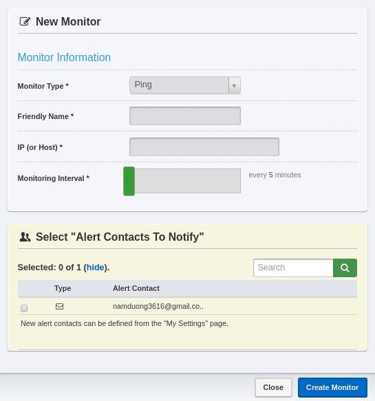 Sau khi đã có tài khoản, mình sẽ vào phần +Monitor và điền các thông số dưới đây