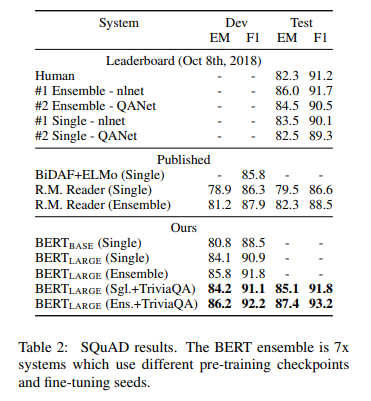 BERT là một khái niệm đơn giản nhưng lại mang lại hiệu quả cực lớn trong thực tế. Nó đã thu được kết quả tối ưu mới nhất cho 11 nhiệm vụ xử lý ngôn ngữ tự nhiên, bao gồm việc đẩy kết quả của nhiệm vụ GLUE benchmark lên 80.4%(cải tiến thêm 7.6%) và SQuAD v.1.1 với F1 score trên tập test đạt 93.2%(cải tiến thêm 1.5%), tốt hơn con người 2%.