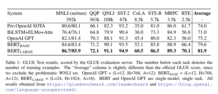 Mô hình được train với batch size bằng 32, training qua 3 epochs với hết dữ liệu trong tất cả các nhiệm vụ thuộc GLUE. Kết quả được thể hiện trong bảng dưới đây.