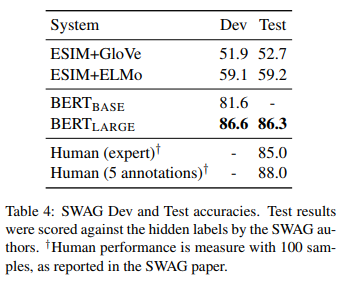 Việc sử dụng BERT trong nhiệm vụ của SWAG tương tư như khi áp dụng nó cho GLUE. Đối với mỗi ví dụ, chúng ta xây dựng 4 chuỗi đầu vào dựa trên 4 đáp án và câu ban đầu, mỗi chuỗi đó được ghép nối bởi câu đã cho(câu A) với câu ghép nối phù hợp(câu B).