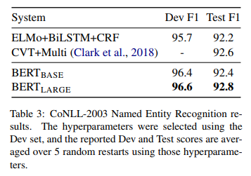 Đánh giá hiệu năng của một nhiệm vụ gán nhãn cho từng tokens, BERT đã fine-tuning trên tập dữ liệu CoNLL 2003 Named Entity Recognition (NER). Đây là tập dữ liệu gồm 200k từ được gán nhãn bằng tay với các nhãn là Person(tên người), Organization(tên tổ chức), Location(tên địa danh), Miscellaneous(tên sản phẩm,...) và Other (không phải thực thể có tên).