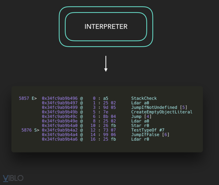 Tiếp theo sẽ là interpreter, nó sẽ phân tích thông qua AST và tạo ra các byte code. Từng dòng code sẽ được phân tích, và tới khi byte code được tạo ra thì AST sẽ bị xóa để giải phóng bộ nhớ
