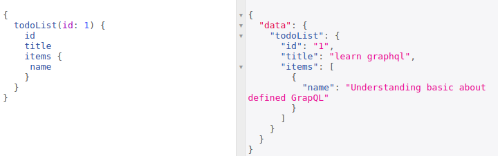 Ở series trước mình đã sử dụng fields rồi nhưng chưa nói kĩ. Hiểu một cách đơn giản thì fields là những thuộc tính của đối tượng và trong Graphql cũng vậy, chúng ta định nghĩa các thuộc tính cần thiết trong kết quả trả về. Để hiểu hơn thì mình có một câu query đơn giản phía dưới và kết quả khi thực thi câu query đó.
