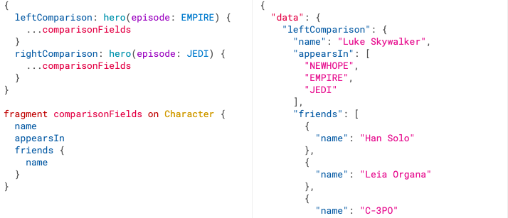 Ví dụ trên chúng ta đã tạo ra một fragment là comparisonFields và include nó vào 2 field leftComparison và rightComparison. Qua ví dụ cho ta thấy các thuộc tính đã giảm thiểu đi 1 lần định nghĩa giúp code clear rất là nhiều.
