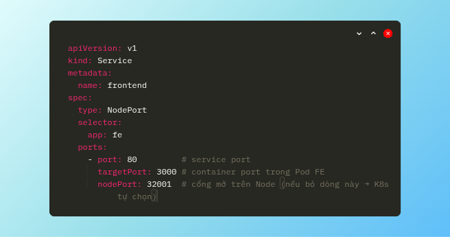 - Mở một port cố định (30000–32767) trên mỗi Node