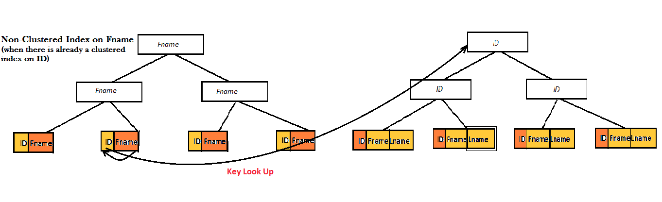 thì InnoDB sẽ thực hiện tìm kiếm trên B Tree của FName, sau khi tìm được node lá tương ứng thì nó tiếp tục cầm giá trị của node lá này (chính là key của clustered index) để quét trên B Tree của ID (clustered index) và trả về giá trị đầy đủ của truy vấn.