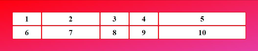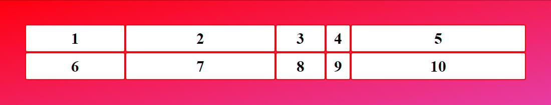 Ví dụ mình có 10 items, mình muốn chia 1 hàng có 5 cột. Đơn vị ở đây các bạn có thể dùng px, %, rem, em, vw, vh, auto. Ngoài ra với flex bạn có thể dùng đơn vị fr dùng để phân bố các items có size có tỉ lệ với nhau.