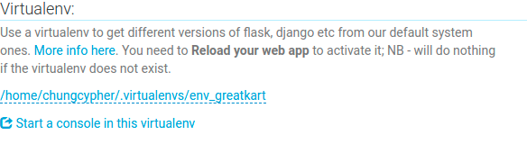 Trở lại Dashboard, mình vào tab Web apps và tạo 1 web, phần tùy chỉnh mình để Manual configuration và python3.7. Tạo xong và click vào Enter path to a virtualenv, if desired, nhập tên môi trường vừa nãy tạo là env_greatkart là được.