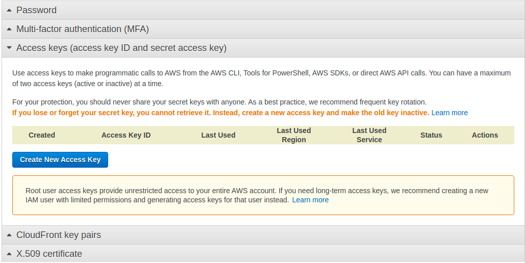 Phần tên repo các mình có thể tùy chỉnh nhưng phiên bản Python mình để là 3.6. Sau đó, mình sẽ phải nhập aws-access-id, mình truy cập vào trang https://console.aws.amazon.com/iam/home?region=us-east-2#/security_credentials, mở dropout Access keys (access key ID and secret access key) và tạo 1 key mới. Ngay khi modal mở ra và thông báo tạo key thành công, mình phải copy cả access key lẫn secret key và paste vào máy local.