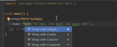 Để chèn nhanh 1 Widget bất kỳ bao bọc (wrap) widget Text lại ta đưa trỏ chuột vào vị trí widget Text và bấm tổ hợp phím Alt + Enter một dialog sẽ hiện ra thế này: