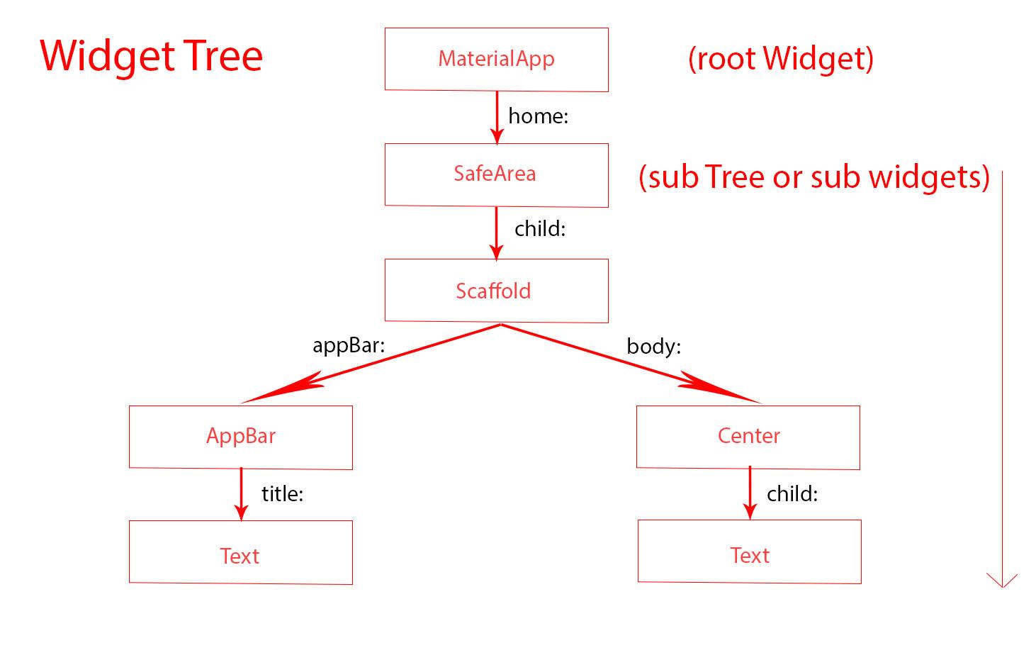 Sau tất cả, cuối cùng chúng ta có 1 cái widget tree như thế này. Widget Tree đơn giản là 1 cấu trúc cây (tree), là một tập hợp các node, trong đó mỗi node chính là một Widget. Các node kết nối với nhau theo quan hệ node cha - node con. MaterialApp là root Widget, là node ông tổ ha. Còn mỗi widget nếu không phải là node lá thì nó đều có sub widgets hay còn gọi là sub tree của widget đó.