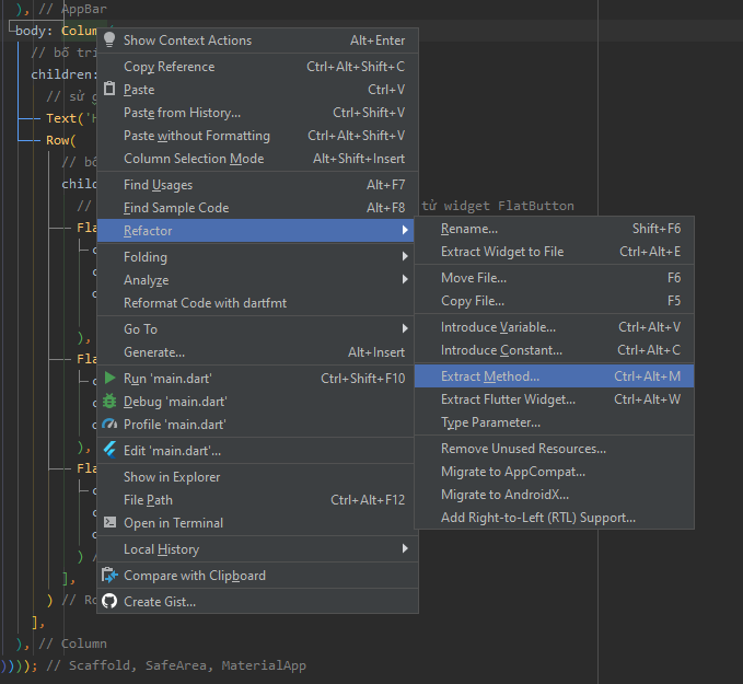 Các bạn di chuyển trỏ chuột vào widget cần extract ra method riêng, click chuột phải, chọn Refactor -> Extract Method rồi đặt tên cho method đó. Ở đây mình đặt tên là buildColumn