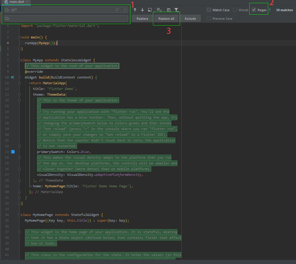 Đùa chút thôi chứ bên trong source toàn là comment không à. Chúng ta mới bắt đầu thì nàng phải comment vào cho chúng ta đọc code dễ hiểu chứ. Còn khi bạn đã có nhiều kinh nghiệm trong chuyện ấy rồi, bạn muốn xóa comment đi cho đỡ chướng mất thì có 1 tip xóa nhanh là: Trong android studio, ở file source main.dart, bấm tổ hợp phím Ctrl + R, 1 toolbox hiện ra như hình dưới, tiếp đến gõ //.* vào ô số 1 dòng trên, dòng dưới để trống. Tiếp theo chọn vào checkbox regex và click vào button Replace all. Cuối cùng bấm tổ hợp phím Ctrl + Alt + L để format lại source code.
