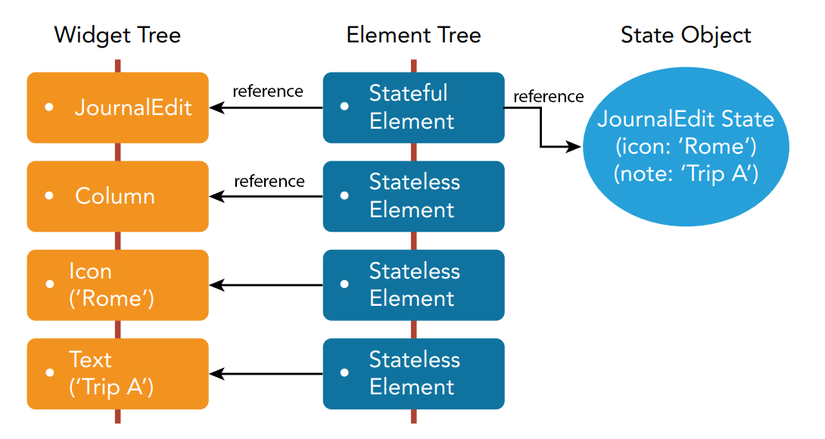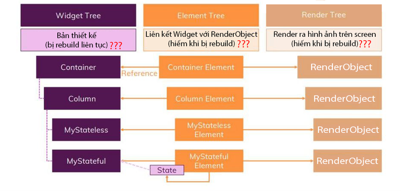Widgetchỉ là một bản thiết kế cho các mảnh UI hiển thị trên màn hình,Elementlà đại diện cho cái mảnh UI đó ở một vị trí nào đó trên cây vàRenderObjectđóng góp vào tô vẽ, căn chỉnh cho cái mảnh UI đó.