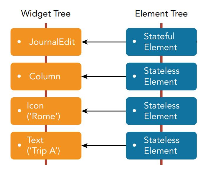 . Nếu như nói Widget là một bản thiết kế của một mảnh UI, thì Element đại diện cho cái thành phẩm, tức là một mảnh UI thật sự được sản xuất từ bản thiết kế đó và mảnh UI này được gắn vào một vị trí cụ thể trên hệ thống cây.