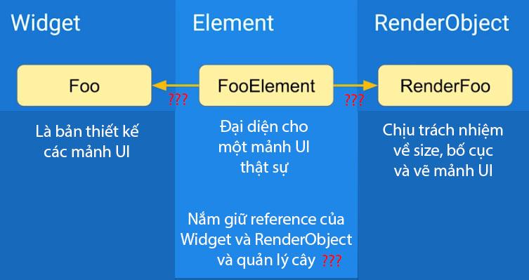 Hai cái dấu mũi tên từ FooElement trỏ đến FooWidget và RenderFoo trong ảnh đó chính là reference. Mỗi Element sẽ nắm giữ reference của Widget và RenderObject và quản lý cả App. Bây giờ chúng ta sẽ tìm hiểu mối quan hệ này giữa 3 đứa nó: Element & Widget & RenderObject
